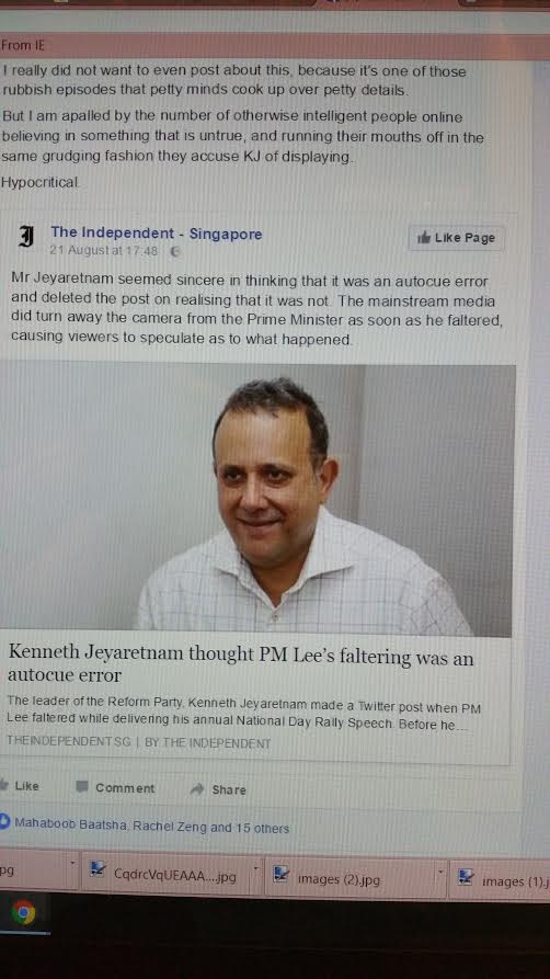 I’ve been here before with the media shooting its mouth off over fabrications about me. The falsehood then was that I had invented threats against my wife, my son and I to gain sympathy votes. The whole country ran with that one. That time after a few days when news broke that two men had been arrested by SPF for threats and therefore that I had been telling the truth all along, everyone deleted their posts faster than Ng E Jay changed his T shirt.