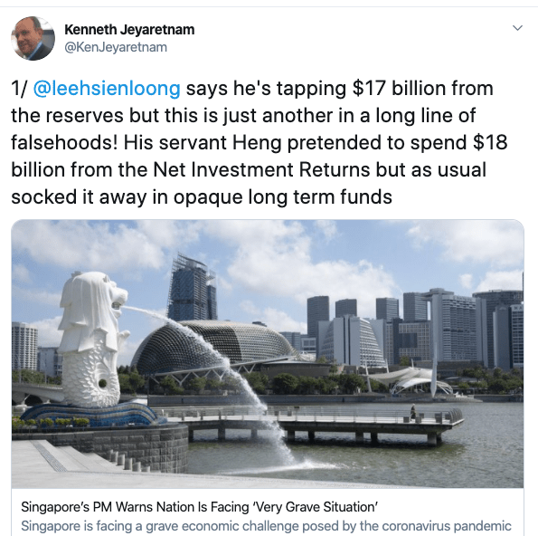 Is Pritam for real? He does not seem to know much about Singapore’s finances. Why would a country with 3.6 million citizens and conservatively over $1 trillion in net assets in past reserves (excluding the value of 90% of Singapore’s land which is owned by the Government-worth at least several trillion dollars) need to introduce austerity measures? As I pointed out, the $17 billion extra spending proposed in the Resilience Budget is easily covered by the $18 billion Net Investment Returns Contribution which Heng did not spend but using his customary sleight of hand transferred into long term funds. The $18 billion in NIRC is less than half the estimated long term return so theoretically Heng has no need to dip into capital at all.