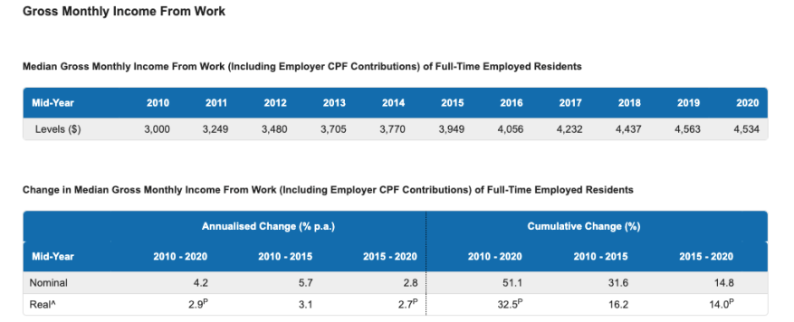 On Thursday December 3rd Ministry of Manpower (MOM) published their figures for 2020 for median gross monthly income from work of full time employed residents, i.e. citizens and PRs. Just to remind readers that if you arranged all the full time workers in Singapore in a line, the median would be the income of the worker at exactly the midpoint. Median is preferred by economists over mean or average since it will be less distorted by extreme measurements at either end. Mean is invariably higher than median because it is skewed by a small proportion of extremely high earners.