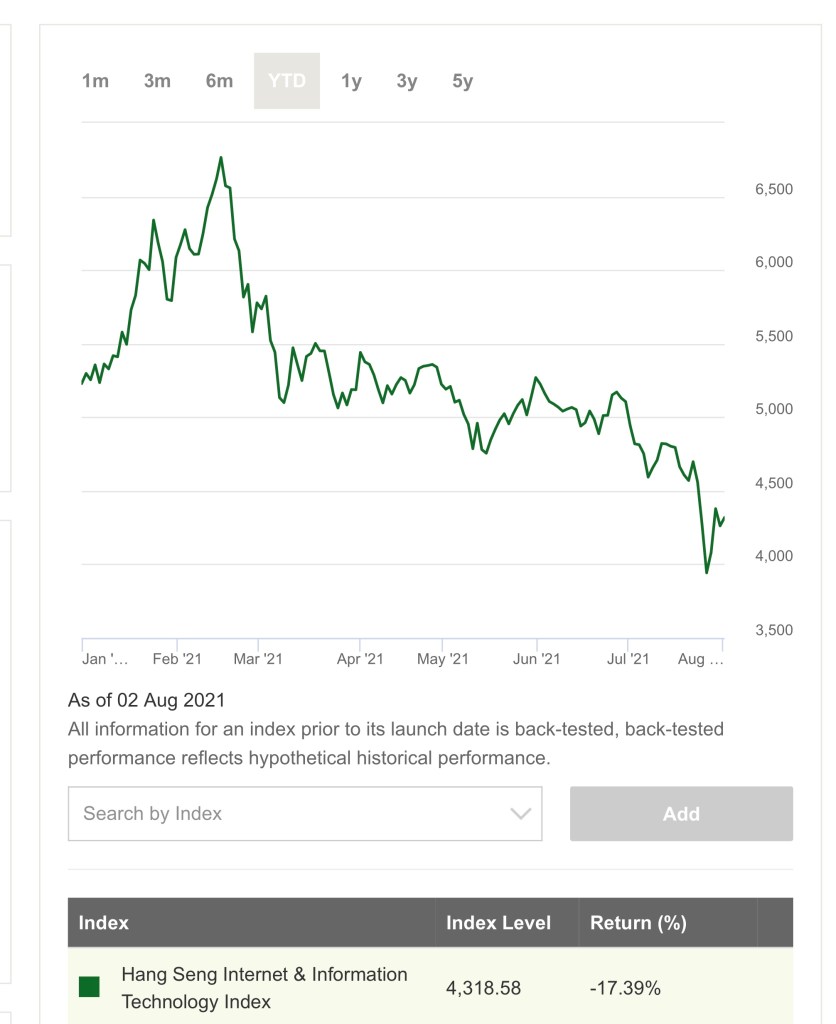 The sell off in China is particularly ironic because just two weeks ago Temasek published its annual report accompanied by glowing articles in the state media and friendly (read sycophantic) foreign financial media like Bloomberg and the Financial Times with headlines like “Temasek posts best shareholder returns in 11 years.” Even without taking account of the sell-off since the balance sheet date, the historic 24.5% return in the year to 31 March 2021 is not as impressive as it appears when we remember that a year before that markets had fallen sharply at the beginning of the pandemic in March 2020. Then later in the year progress on developing vaccines and massive Government aid packages caused a gigantic relief rally. In fact between 31 March 2020 and 31 March 2021 the S&P 500 index rose twice as fast, by 53.7%, while the MSCI World Index rose by 52.0%. The Shanghai Composite Index only rose by 25% while the Hang Seng Technology Index.
