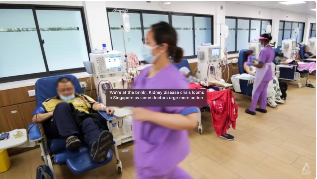 Today state media mouthpiece CNA published an article entitled ‘We’re at the brink’’: Kidney disease crisis looms in Singapore as some doctors urge more action. It highlighted the fact that 300,000 people in Singapore have chronic kidney disease (CKD) with an estimated 200,000 others with the disease going undetected. Dialysis centres are under huge pressure with nearly every slot in the National Kidney Foundation (NKF) dialysis facilities filled. According to a 2018 study published in the International Journal of Nephrology, by 2035 almost a quarter of Singapore residents over the age of 21, or could have.CKD while 500,000 cases could be undiagnosed.