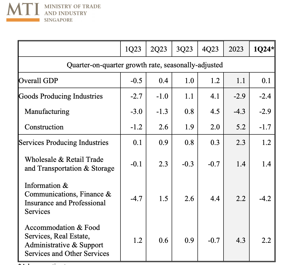 On Friday 12 April the Ministry of Trade and Industry (MTI) put out a press release headlined “Singapore’s GDP Grew by 2.7 Per Cent in the First Quarterof 2024″. The report went on to say that “Based on advance estimates, the Singapore economy grew by 2.7 per cent on a year-on-year basis in the first quarter of 2024, faster than the 2.2 per cent growth in the previous quarter.” However in the next sentence MTI says “On a quarter-on-quarter seasonally adjusted basis, the economy expanded by 0.1 per cent, extending the 1.2 percent expansion in the fourth quarter of 2023. So, in contradiction to what MTI said in the first sentence, the economy actually lost momentum and slowed down considerably in the first quarter. In fact, if it hadn’t been for the Taylor Swift concerts, won by probably paying far more than has been claimed and at the cost of upsetting ASEAN neighbour Thailand (which will likely try to emulate Singapore’s bribery next time triggering a competition that can only benefit Taylor Swift and other artists), and other headline events, economic growth would probably have been negative. On a quarter-on-quarter basis, accommodation and food services grew by 2.2% while goods producing industries fell by 2.4% and financial services by 4.2%.